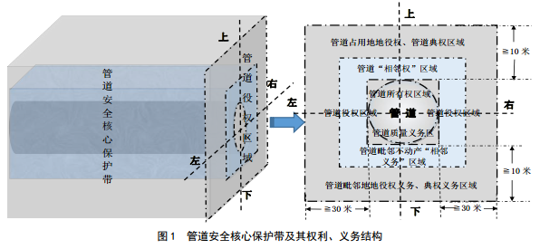 管道安全核心保護帶是以管體為中心、以管道財產(chǎn)所有權為半徑的保護管道財產(chǎn)安全的管道安全中心區域帶(圖 1),其法律義務(wù)都是法定義務(wù),其保護法益是管道財產(chǎn)安全。分為兩個(gè)層次:一是管道企業(yè)所承擔的管道質(zhì)量義務(wù),實(shí)質(zhì)上是管道財產(chǎn)所有權本身所負擔的法定義務(wù)。二是管道基于不動(dòng)產(chǎn)相鄰關(guān)系而施加于管道毗鄰不動(dòng)產(chǎn)所有權、使用權的合理限制或負擔,實(shí)質(zhì)上是基于民法的不動(dòng)產(chǎn)相鄰關(guān)系的管道所有權權能在管道毗鄰不動(dòng)產(chǎn)上的合理延伸。