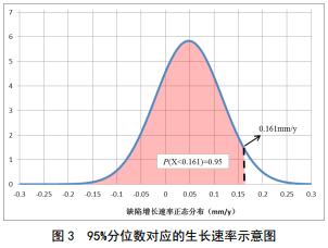 基于內檢測數據對比和以上計算過(guò)程,可以確定每一缺陷的生長(cháng)速率正態(tài)分布模型。 DNV-RP-F 101- 2015中2.9.2.1章節對管道剩余壽命預測進(jìn)行了描述, 推薦選取95%分位數對應的生長(cháng)速率值計算管道剩余 壽命,如圖 3所示。其計算公式為μ+1.645σ。 該計算模型既能較為合理的反映各個(gè)缺陷的生長(cháng)特性;又充分考慮了內檢測的精度誤差。