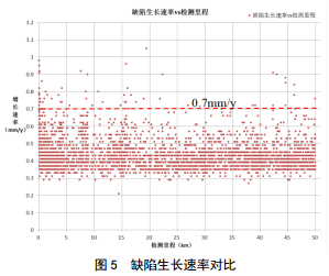 根據內檢測數據對比結果,應從保守性和合理性的角度出發(fā),結合管段自身特點(diǎn)、缺陷生長(cháng)特性以及內檢測精度指標等因素,合理計算并選取缺陷生長(cháng)速率值。