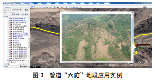 (1)“六防”區域管理。確定六防區域位置,收集典型照片,進(jìn)行現狀描述。某管道滑坡段位于延安市志丹縣雙河鄉墩梁村,屬濕陷性黃土V字型陡坡地段,通過(guò)該系統,可對管線(xiàn)所經(jīng)區域地形地貌、高度落差、周邊道路情況、泄漏流向、圍堵點(diǎn)選擇等進(jìn)行鳥(niǎo)瞰瀏覽(圖 3)。