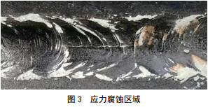 管道應力腐蝕區域,呈現特殊類(lèi)型的細、淺和分 枝開(kāi)裂,常發(fā)生在涂層失效時(shí),特別是無(wú)有效的陰極防護措施時(shí),如圖 3所示。