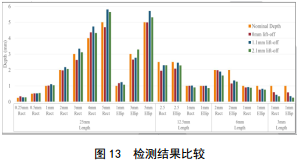 經(jīng)檢測所有加工缺陷,在0.25~3.00 mm深度范圍內,檢測誤差+/-10%;同時(shí)也通過(guò)了最大提離2mm驗證。但對于長(cháng)度短于5 mm的較小缺陷,特別是長(cháng)度與深度比小于3的缺陷,檢測結果略微偏小。結果如圖 13所示。
