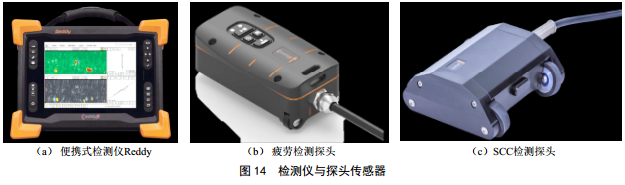 根據切向渦流原理,提出了一套完整的專(zhuān)用解決方案;設計了專(zhuān)為現場(chǎng)使用的便攜式檢測儀Reddy®;開(kāi)發(fā)了嵌入式Magnifi軟件;開(kāi)發(fā)了SharckBW探頭用于管道焊縫的疲勞開(kāi)裂、 sharck HR探頭用于管道母材的SCC,如圖 14所示。