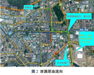 (1)漏油現場(chǎng)情況。管道噴出地面的原油蔓延至附近的街道路面,部分原油通過(guò)路面的水箅子或窨井進(jìn)入市政雨水管網(wǎng)和污水管網(wǎng),污水管網(wǎng)的原油流入污水處理廠(chǎng),雨水管網(wǎng)的原油則流入排水明渠。管道泄漏的油品為阿曼原油,凝點(diǎn)-30℃,輕質(zhì)成分較多,揮發(fā)性較強。