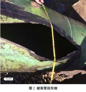 管道開(kāi)挖后,在破裂位置發(fā)現了施工期間安裝的混凝土配重塊。破裂管段和一部分配重塊運往NTSB的材料實(shí)驗室進(jìn)行檢測。圖 2為開(kāi)挖后運送至NTSB前破裂管段形貌。