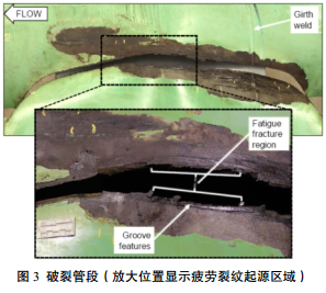 在NTSB材料實(shí)驗室,清洗破裂管段后進(jìn)行可視化檢查。冶金專(zhuān)家發(fā)現破裂表面(140 mm長(cháng)區域)沿長(cháng)度方向的中部、棘輪標志、止裂線(xiàn)和其他特征表明初始在管壁外部的溝槽位置發(fā)生了疲勞裂紋開(kāi)裂。疲勞的起源區域位于管道的頂部,距離縱焊縫165 mm,在開(kāi)裂終點(diǎn)的上游位置存在密集的溝槽(圖 3)。