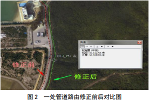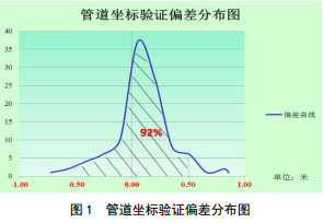 通過(guò)集成應用工程測量、智能檢測、航空攝影測量、地下管線(xiàn)探測、數據比對、坐標修正與轉換六項技術(shù),解決了在役管道難以獲取必要的基礎性數據問(wèn)題,獨創(chuàng )3S技術(shù)集成應用。運用該技術(shù)對某管道全線(xiàn)開(kāi)挖驗證105個(gè)點(diǎn),數據偏差全部在±0.86米以?xún),其中在?.5米之內的占92%(圖 1),實(shí)現管道大量基礎數據校準與更新,例如圖 2為一處管道路由修正前后對比圖,最終使管道中線(xiàn)坐標偏差控制在±1米以?xún)取?o:p>