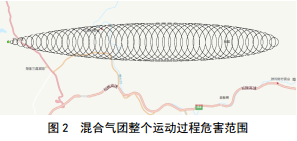 將混合氣團模擬時(shí)間點(diǎn)取至200 s,運行高斯煙團模型,得到混合氣團整個(gè)運動(dòng)危害范圍,見(jiàn)圖2。