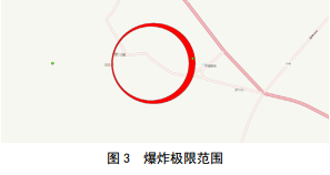圖 3爆炸極限區域覆蓋面積19 552 m2,在該區域一旦出現明火,將直接導致混合氣團爆炸,爆炸產(chǎn)生的超壓沖擊波將會(huì )造成更大范圍傷害。在當地壓力和溫度下,天然氣密度為0.6 kg/m3,則泄漏的天然氣質(zhì)量為72 000 kg。以點(diǎn)火源為爆炸中心,燃燒熱取甲烷的燃燒熱55 600 kJ/kg, TNT爆炸熱取4 500 kJ/kg,假設泄漏的天然氣全部參與爆炸,則根據表 1中沖擊波超壓值運行爆炸模型,爆炸超壓波影響建筑物范圍如圖 4所示。