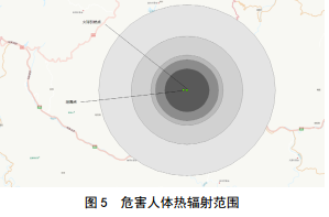 設200 s時(shí),出現一處引燃點(diǎn)引燃混合氣團變成火球,假設泄漏的天然氣全部參與形成火球,由于噴射火的危害主要是熱輻射,故參照熱通量傷害準則表 2,運行火球模型,影響人體熱輻射范圍如圖 5所示。