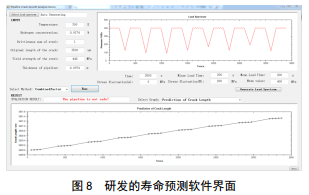 圖 8中展示了隨機生成的欠載譜圖,和計算剩余壽命前需要收集的數據。從譜圖中可以得到加載的應力強度變化和加載頻率等信息。初始輸入的數據為環(huán)境溫度(實(shí)測)、基體氫濃度(滲氫電流密度實(shí)驗)、材料的脆性參數(計算擬合,屈服強度越高越接近1)、裂紋的原始長(cháng)度(管道內檢測)、材料屈服強度、管壁厚度(實(shí)測);谝陨犀F場(chǎng)數據和管道內應力變化,預測管道中裂紋長(cháng)度。