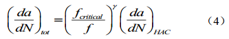 ,這一模型忽略了加載頻率等外界條件對于裂紋生長(cháng)的影響[13]。疊加模型作為對Paris模型的補充,將加載頻率引入模型中,但是對加載頻率的作用未給出準確量化,而且對于應力腐蝕(SCC)和疲勞(fatigue)的關(guān)系也沒(méi) 有 明 確 的 解 答[ 1 4 , 1 5 ]。 聯(lián) 合 因 子 模 型 如 公 式
