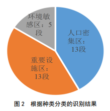 借助GIS系統與現場(chǎng)調研,共識別高后果區31段,長(cháng)度32.36 km,占管道總長(cháng)度的32.22%。根據等級分類(lèi)的高后果區識別結果如圖 1所示,其中III級高后果區8段,長(cháng)度為11.47 km; II級高后果區19段,長(cháng)度為19.47 km; I級高后果區4段,長(cháng)度為1.42 km。根據種類(lèi)分類(lèi)的高后果區識別結果如圖 2所示,其中人 口密集區13段,長(cháng)度為13.71 km;重要設施區13段,長(cháng)度為12.83 km;環(huán)境敏感區5段,長(cháng)度為5.82 km。