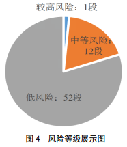 首先基于高后果區識別結果,結合站場(chǎng)和閥室兩個(gè)因素,對該成品油管道劃分為65段風(fēng)險評價(jià)管段;然后根據調研的管道設計竣工資料、各類(lèi)專(zhuān)項評價(jià)報告、管道的運行數據和失效歷史、管道沿線(xiàn)的自然及人文環(huán)境信息等,對各項因素進(jìn)行評分;最后得到該管道的風(fēng)險值,如圖 3所示。根據風(fēng)險評價(jià)結果與風(fēng)險等級確定標準,得到各管道的風(fēng)險等級,如圖 4所示,其中較高風(fēng)險1段,此段也為高后果區;中等風(fēng)險12段;低風(fēng)險52段。