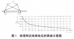 直流輸電線(xiàn)路的桿塔設有接地裝置,當輸電線(xiàn)路出現短路故障或者遭受雷擊時(shí),一部分電流 I G會(huì )從鐵 塔的接地裝置(接地阻抗為 Z G)流入大地,此時(shí)鐵塔電位為 U Gmax=I G×Z G。電流通過(guò)大地向遠處擴散,周?chē)乇黼娢粫?huì )產(chǎn)生一定的電位升U G ,從而使經(jīng)過(guò)的管道對地電位升高。圖 1為鐵塔附近地表電位的衰減示意圖,由此可見(jiàn),當桿塔接地距離管道較近時(shí),短路故障或者遭受雷擊時(shí)管道電位大幅上升,可能擊穿管道防腐層或者對在管道上進(jìn)行測量或維修作業(yè)的人員造成不利影響。