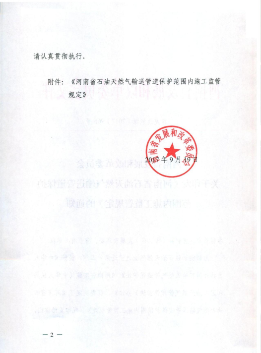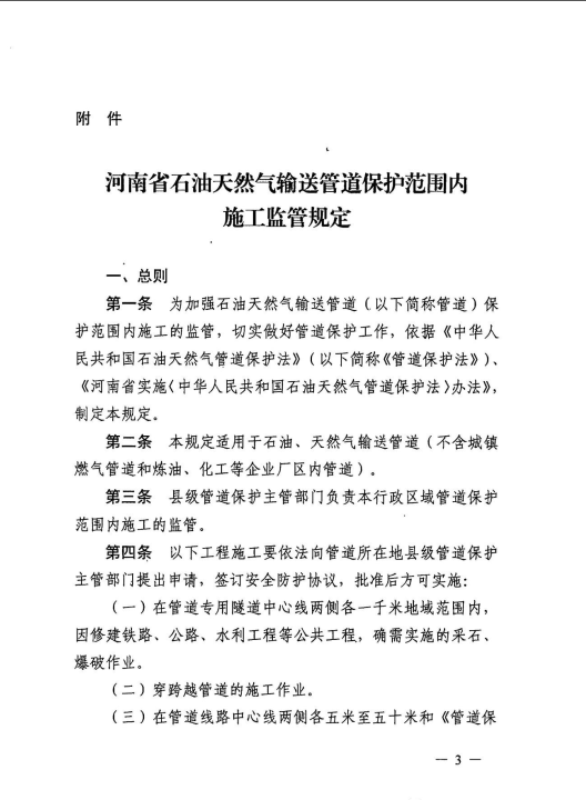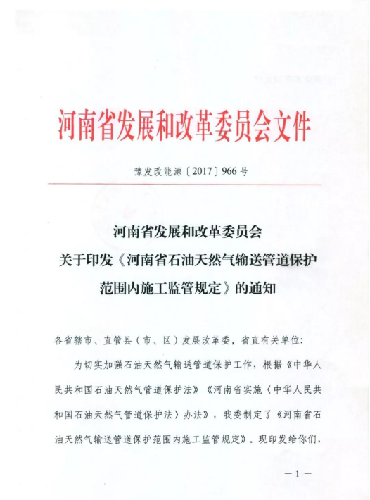 河南省發(fā)展和改革委員會(huì )關(guān)于印發(fā)《河南省石油天然氣輸送管道保護范圍內施工監管規定》的通知