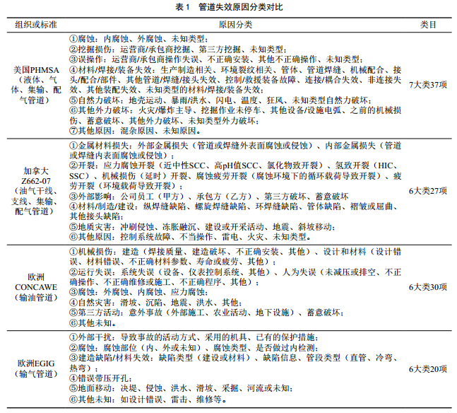 在風(fēng)險評價(jià)過(guò)程中,失效數據的統計非常重要,通過(guò)對管道失效的歷史數據進(jìn)行統計與分析,可以使管道危害因素分類(lèi)更為合理。表 1是國外管道失效數據庫中對管道失效原因的對比與分類(lèi),其中已包括美國運輸部管道與危險材料安全管理局(PHMSA)、加拿大標準協(xié)會(huì )(CSA)、歐洲輸油管道(CONCAVE)和輸氣管道(EGIG)等國際主要的管道失效數據庫[1-6]。
