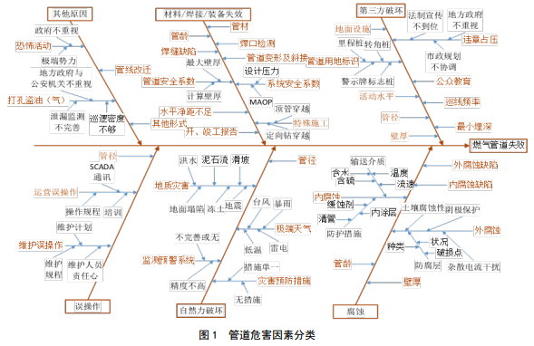 綜合上述情況,并考慮到我國油氣管道的具體情況,將管道危害因素分為腐蝕、自然力破壞、第三方破壞、材料/焊接/裝備失效、誤操作及其他原因等6大類(lèi),每類(lèi)又與諸多因素有關(guān),用魚(yú)骨圖細化了各類(lèi)危害因素,如圖 1所示。