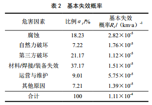 基本失效概率需要通過(guò)大量的統計資料獲得。統計資料來(lái)源于油氣管道事故的歷史記錄,如油氣管道失效數據庫。根據前面對各數據庫油氣管道事故的分類(lèi)統計,按照式(2),計算得到油氣管道基本失效概率如表 2所示。