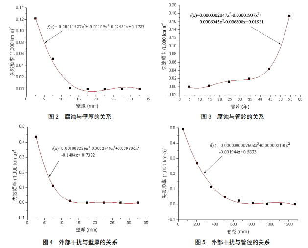 定量指標需要大量的統計數據做支撐。通過(guò)分析管道失效數據庫,可以得到壁厚、管徑、管齡、埋深、鋼級等參數與管道失效概率間的關(guān)系,如圖 2―5,擬合成函數,從而得到這些參數與失效概率間的函數關(guān)系,即定量關(guān)系。