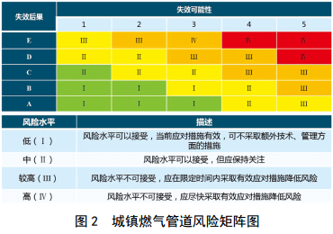 風(fēng)險評估結果的準確性和有效性取決于數據采集的完備程度, GB/T 27512―2011《埋地鋼質(zhì)管道風(fēng)險評估方法》不適用于非金屬城鎮燃氣管道,且依據管道沿線(xiàn)人口密集程度、土壤腐蝕性、建筑物的密集程度和重要程度劃分管段也不盡合理?蓪⑷細夤艿佬孤┑墓收蠘(shù)模型與事件樹(shù)模型結合開(kāi)展定量評價(jià),通過(guò)最小割集計算得出導致管道泄漏的主要風(fēng)險因素,利用三角模糊數表示燃氣管道泄漏后果的發(fā)生概率和后果的嚴重程度,采用專(zhuān)家評分法、模糊層次分析法、模糊綜合評價(jià)技術(shù)確定管道泄漏后果的風(fēng)險等級,以實(shí)現燃氣管道的分級管理。最終建立風(fēng)險矩陣圖(圖 2),實(shí)現動(dòng)態(tài)風(fēng)險評估并指導檢驗維修。