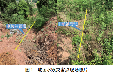 (1)水毀災害。地 質(zhì) 災 害 主 要 以 坡 面 和 河(溝)道水毀為主(圖 1)。需要調閱和調查當地水文資料(暴雨頻率等)、災害點(diǎn)地形地貌(坡長(cháng)等)、管敷情況(埋深等)等 。