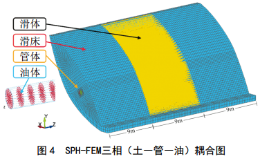 為避免滑坡作用下滑坡體及管內輸送介質(zhì)發(fā)生大形變而致使計算終止,采用光滑粒子流體動(dòng)力學(xué)法(SPH),將問(wèn)題域離散成一系列不依賴(lài)于網(wǎng)格的粒子;針對滑床及管體小變形區域,采用傳統的更具效率的有限元法(FEM),并在其交界面處通過(guò)設置接觸形式,實(shí)現SPH-FEM算法的耦合,最大限度發(fā)揮兩者優(yōu)勢,實(shí)現滑坡下土―管―介質(zhì)多物理場(chǎng)完全耦合建模(圖 4)?紤]模型整體重力,并與時(shí)間相關(guān)聯(lián),最大程度復原滑坡演變過(guò)程,并獲取不同時(shí)刻下管體應力/應變及位移情況,為管體防護工作提供理論支撐與技術(shù)指導。