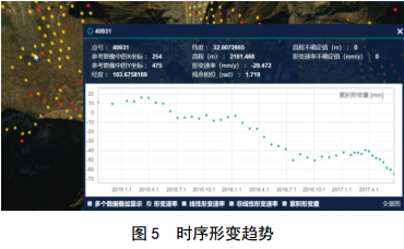(2)基于InSAR的地質(zhì)災害監控關(guān)鍵技術(shù)。采用衛星遙感監測技術(shù)(InSAR)對成彭管道災害多發(fā)的管段進(jìn)行監測。通過(guò)InSAR廣域處理,對管道全區域進(jìn)行普查,實(shí)現對隱患點(diǎn)變化趨勢的動(dòng)態(tài)跟蹤;并通過(guò)每12天一次的時(shí)序變形監測分析,對有緩慢形變的區域及時(shí)分析和預警,對已變形的災害區域二次預 警和防范。專(zhuān)題數據包括所有形變點(diǎn)云的經(jīng)緯度位置信息,形變速率,內檢驗經(jīng)度信息,每一時(shí)刻形變量信息。專(zhuān)題圖表包括管線(xiàn)區域的形變速率、時(shí)序形變趨勢、累積形變量、形變面積、沉降區域的邊界等信息(圖 5)。