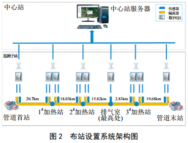 在某油田輸油管道(中間設置加熱站3座)安裝一套S-image次聲波管道泄漏監測系統,由中心主站、監測子站兩部分組成,五個(gè)監測子站即管道首站-1#加熱站-2#加熱站-55公里處排氣室-3#加熱站-管道末站。布站設置系統架構見(jiàn)圖 2。