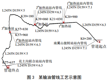 監測管道長(cháng)80 km,管線(xiàn)規格為D159×6.3,材質(zhì)為L(cháng)245N無(wú)縫鋼管,輸送介質(zhì)為凈化原油,管道高程為2 719 m~3 377 m。其工藝示意圖見(jiàn)圖 3。