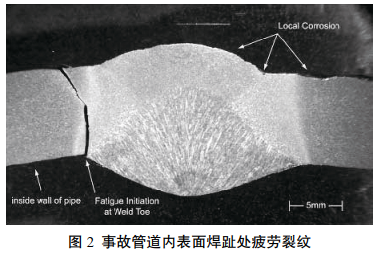 據資料記載, Enbridge在1974年、 1979年、 1982年、 1986年、 1989年和1991年均發(fā)生了管道縱向焊縫失效事故,管道都由美國鋼鐵公司生產(chǎn)。經(jīng)金相分析認定,破裂原因為焊趾處發(fā)生疲勞裂紋擴展導致失效。 Enbridge管徑863.6 mm管道系統還使用了A.O.Smith公司閃焊管道、加拿大Phoenix公司電阻焊管道、 Kaiser Steel公司埋弧焊管道,而所有由疲勞裂紋引起的縱向焊縫失效管道都產(chǎn)自美國鋼鐵公司。