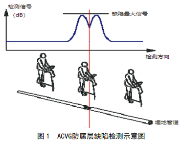 交流電壓梯度檢測設備由交流電壓梯度檢測儀、檢測信號發(fā)射機、管線(xiàn)探測儀3個(gè)部分組成。檢測信號加載到埋地管道上時(shí),其在埋地管道防腐層缺陷位置通過(guò)土壤匯流到信號發(fā)射機,相應地就在管道防腐層缺陷附近產(chǎn)生交流地電場(chǎng)。越接近缺陷的部位管道上方地面的電流密度就越大,交流電壓梯度也就越大。使用交流電壓梯度檢測儀沿管道檢測并定位這些交流地電場(chǎng)梯度異常點(diǎn),即可確定埋地管道外防腐層缺陷的位置,如圖 1所示。