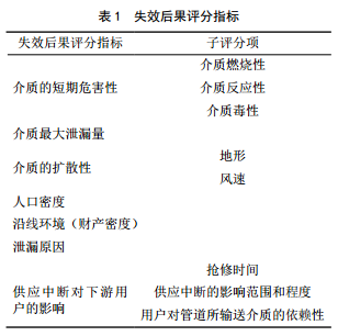 埋地聚乙烯燃氣管道失效后果評分從介質(zhì)的短期危害性、介質(zhì)的最大泄漏量、介質(zhì)的擴散性、人口密度、沿線(xiàn)環(huán)境、泄漏原因和供應中斷對下游用戶(hù)影響七個(gè)方面進(jìn)行半定量評分,失效后果得分為每個(gè)指標的得分之和。