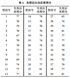 從表 3可知:失效可能性得分范圍為48.5~59.2,失效可能性差別較大主要是因為各管段人口密度、交通繁忙程度、占壓情況、埋深情況不同而引起。