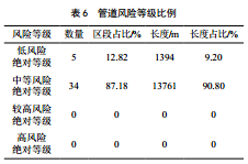 結果表明,風(fēng)險值范圍為3152.5~4596.8,中等風(fēng)險值居多。表 6統計了管道風(fēng)險等級的比例。