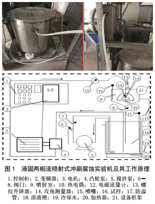 實(shí)驗在液固兩相流噴射式?jīng)_刷腐蝕實(shí)驗機上進(jìn)行。實(shí)驗前,根據現場(chǎng)工況通入一定量的CO2后注入N2,保證液體中沒(méi)有O2存在,避免O2對實(shí)驗過(guò)程產(chǎn)生影響[1],如圖 1所示。