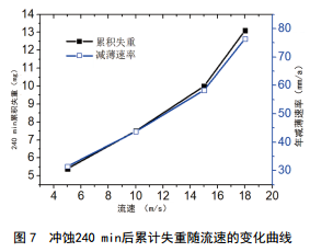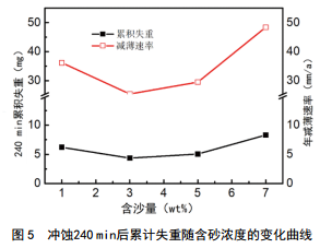 (1)低含砂量條件下(1 wt%~5 wt%),含砂濃度對累積失重的變化影響不大。當含砂量增大到7 wt%時(shí),沖蝕失重迅速上升。