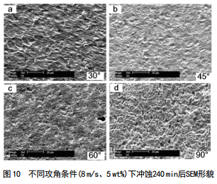 如圖 8、圖 9、圖 10所示,當攻角為30°時(shí),砂粒犁削材料表面的劃痕最長(cháng),劃痕沿流體沖刷的方向性最明顯,損傷最嚴重。犁溝邊緣有明顯的材料變形堆積現象,呈典型的塑性變形特征。隨著(zhù)攻角的逐漸增大,犁削型劃痕的長(cháng)度逐漸縮短,損傷由犁溝型逐 漸轉變成沖擊坑型。如上這種損傷形貌特征的轉變,意味著(zhù)不同的磨損機理。只要沖擊角度小于90°,就存在一定的犁削作用。即使在較小的流速下,液固兩相流中較小的顆粒也能夠造成材料表面的磨損,但相比高流速而言,造成相同損傷量的時(shí)間更長(cháng)。因此,當攻角變大,正應力明顯減小時(shí),材料表面的沖蝕損傷也就變弱,導致樣品的質(zhì)量損失減小[4]。此外,沖擊角度對于材料質(zhì)量損失的影響還要依賴(lài)于材料的屬性。對于塑性材料而言,小攻角會(huì )造成較高的質(zhì)量損失,這是因為在小攻角時(shí),顆粒對材料的剪切作用占了主導地位。