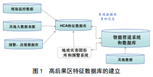 為了建立完整的高后果區特征數據庫,需要綜合各系統和數據庫資源。以智能管道系統和數據庫作為基礎,包括管道的基礎數據如:管材、焊接工藝、管徑壁厚、輸送介質(zhì)、埋深鋪管等;管道的運營(yíng)數據如:工作壓力、溫度變化、清管泄壓、內外檢測數據等;管道的評價(jià)數據:腐蝕缺陷、剩余強度檢測、維修檢測、風(fēng)險評價(jià)等[11]。還包括地質(zhì)災害圖形庫和預警系統數據,現場(chǎng)監控的實(shí)時(shí)更新數據,預警、決策數據庫的評價(jià)預測數據,以及其他相關(guān)的大數據來(lái)源。特征數據庫建立如圖 1所示。