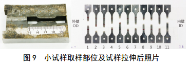 為進(jìn)一步研究焊縫金屬內不同區域的性能差別,進(jìn)行了焊縫微區小試樣拉伸測試。小試樣厚度為0.75 mm、總長(cháng)度50 mm,取樣位置和拉伸后宏觀(guān)照片見(jiàn)圖 9,測試結果見(jiàn)圖 10。