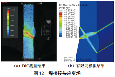 取焊接接頭板狀拉伸試樣進(jìn)行測試,焊縫位于試樣中部,試樣內外表面保持焊縫原有狀態(tài),試樣側面精磨并噴漆,以制造表面特征便于計算機處理(圖 11)。試驗過(guò)程用雙目相機對試樣側面成像并計算應變,結果見(jiàn)圖 12(a)?梢(jiàn),低強匹配焊縫接頭拉伸時(shí)應變分布不均勻,在焊縫內部高應變區呈X形分布, X形的四個(gè)點(diǎn)為內外壁焊趾,高應變區與主應力方向近似成45度,此分布特征也可以利用有限元計算得出(圖 12(b))。 X形的變形集中帶表明管線(xiàn)的變形將主要集中在焊縫區內。低強匹配的焊縫將影響高鋼級管道的抗變形能力。