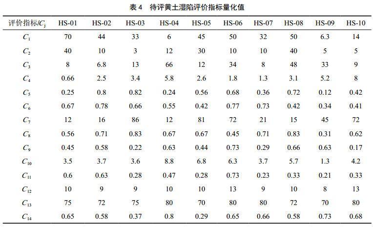 選取的10處黃土濕陷災害點(diǎn)列為一組評價(jià)單元,創(chuàng )建的待評物元如式(14)所示。依據表 1,評價(jià)單元實(shí)測值結合調查人員評分結果得評價(jià)指標量化值,見(jiàn)表 4。
