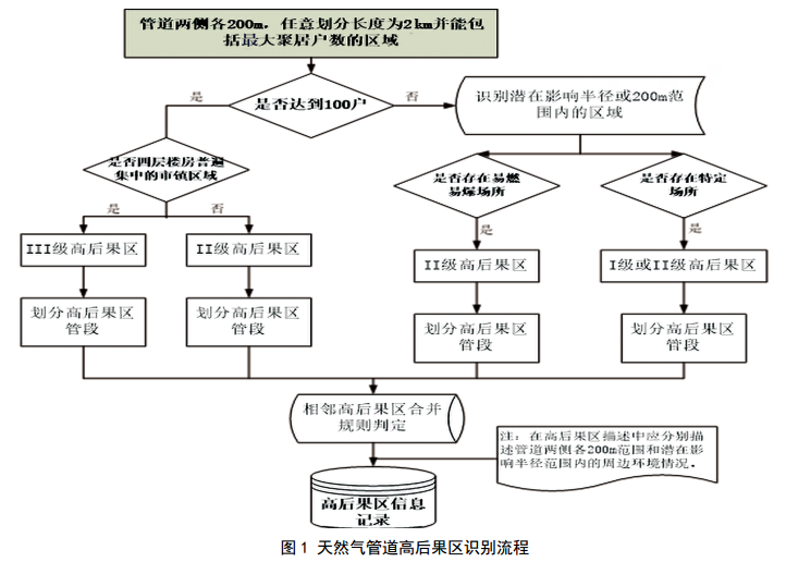 高后果區識別與評價(jià)是風(fēng)險管控的前提,天然氣管道高后果區識別依據為GB 32167―2015《油氣輸送管道完整性管理規范》,識別內容包括管道屬性、運行數據、環(huán)境數據、檢測維護數據、應急資源信息、人口分布、建構筑物屬性等數據。識別范圍為①潛在影響半徑小于200米的,收集范圍200米;②潛在影響半徑大于200米的,收集范圍按照潛在影響半徑收集。 識別流程如圖 1所示。