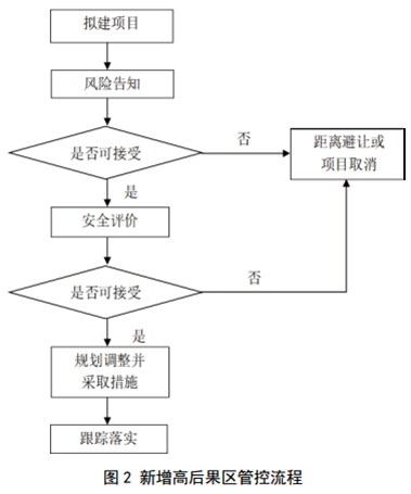 根據138號文“管好存量,嚴控增量”要求,企業(yè)主動(dòng)走訪(fǎng)地方規劃、國土等部門(mén),收集管道周邊建設規劃信息,履行風(fēng)險告知義務(wù)。 2019年,共向各級地方政府、職能部門(mén)(區縣級發(fā)改委、規劃局、應急管理局等)及建設單位發(fā)送高后果區風(fēng)險告知函181份,參與協(xié)調70余次,通過(guò)高后果區風(fēng)險定量評價(jià),在地方接受風(fēng)險告知后調整規劃,“阻止”了新增高后果區41段,明顯遏制了高后果區增量及風(fēng)險等級升高的勢頭。新增高后果區管控流程如圖 2所示。