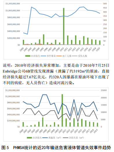 2000~2019年20年間, PHMSA共收到7 314起輸送危害液體管道失效故事件報告,累計造成29人死亡、 81人受傷,經(jīng)濟損失達到39.55億美元,泄漏總量 2 9 . 5 7萬(wàn) m 3,凈泄漏損失量 1 7 . 8 7萬(wàn) m 3;平均每年 3 6 6起,每年1人死亡、 4人受傷,每年經(jīng)濟損失1.98億美元,每年泄漏總量1.48萬(wàn) m 3,每年凈泄漏損失量 0 . 8 9萬(wàn) m 3。 P H M S A統計的近20年輸送危害液體管道失效事件趨勢如圖 5所示。