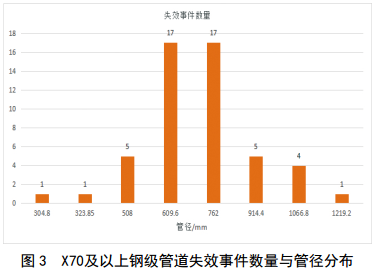管道失效事件主要發(fā)生在609 mm (1 7 起 ,33.3%)和762 mm(17起, 33.3%)管徑的管道,X70及以上鋼級大口徑管線(xiàn)(>508 mm)失效事件數量約為小口徑(≤508 mm)管線(xiàn)的6倍(圖 3)。