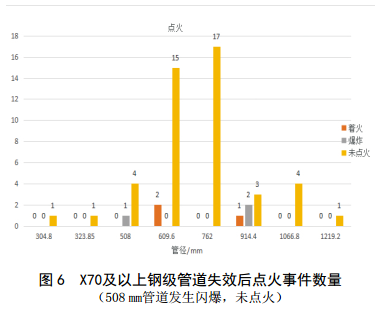 如圖 6所示,管道失效后發(fā)生點(diǎn)火事件6起,著(zhù)火3起、爆炸3起(其中914.4 mm管道同時(shí)發(fā)生著(zhù)火爆炸),未點(diǎn)火事件46起?傮w來(lái)講,點(diǎn)火的可能性為9.8%(即(1-46)÷51 = 0.098),點(diǎn)火后出現著(zhù)火或爆炸的幾率大致相當。