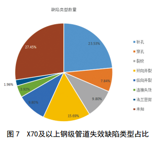 失效主要原因為制造與施工缺陷(材料失效、施工/材料缺陷)共29起,占比56.9%;第三方損壞(開(kāi)挖損傷)共7起,占比13.7%;腐蝕共6起,占比11.8%;自然與地質(zhì)災害(自然災害)和誤操作各4起,分別占比7.84%;其他為1起,占比1.96%(圖 8)。
