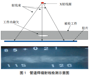 天然氣管道射線(xiàn)檢測常用射線(xiàn)照相法,即用X射線(xiàn)或γ射線(xiàn)穿透試件,以膠片作為記錄信息的無(wú)損檢測方法。如圖 1所示。