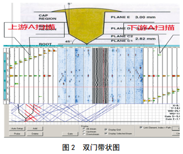 (2) AUT檢測。采用相控陣技術(shù),只使用一對相控陣探頭(一般為60陣列,相當于60個(gè)常規探頭),完成A掃描、 B掃描、 TOFD(超聲波衍射時(shí)差法)及聲耦合顯示缺陷方法。其中, A掃描,負責檢測焊縫坡口面上的面積型缺陷; B 掃描,負責檢測焊縫體積型缺欠; TOFD掃描負責檢測盲區的缺陷。管道檢測雙門(mén)帶狀圖如圖 2所示[3]。